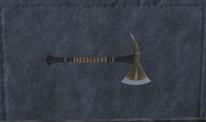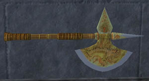 Enfin, une quête particulière, parfois donnée par des Guides (pas toute l'année), permet d'obtenir des recettes d'armes décoratives. Pour rappel, les Guides sont des joueurs bénévoles proposant des quêtes et de l'animation role play sur les serveurs. Ils signalent parfois leurs quêtes à l'avance sur le forum officiel, section française, roleplay et événements. La quête "Fou de Haches" demande d'aller examiner des haches à l'entrée de Kaladim et dans les forts d'Est et Ouest Pas de Fer.